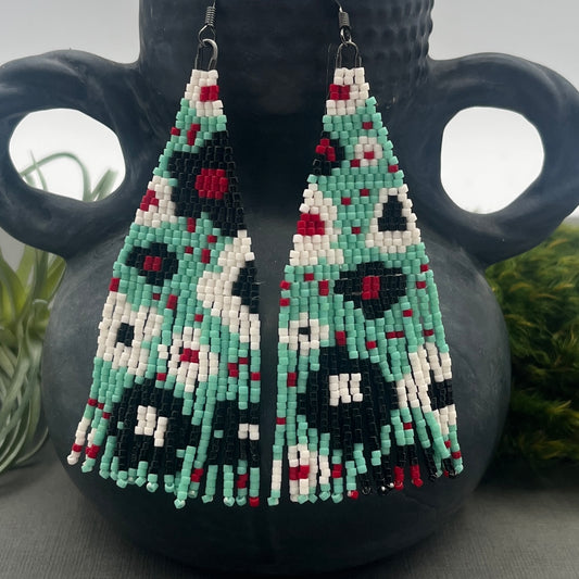 Floral black, white, red and Turquoise Hand Woven Fringe Beaded Earrings