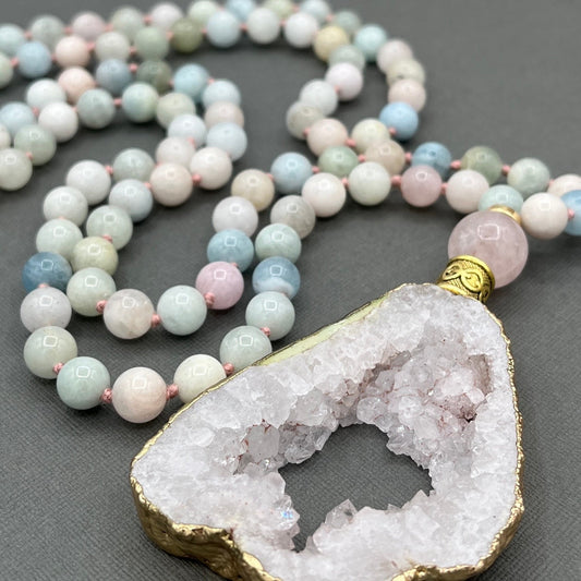 Morganite and Rose Quartz, Japa Mala Necklace, long necklace with tassel, Yoga, Meditation Beads, Yoga Beads, BoHo necklace, Prayer Beads
