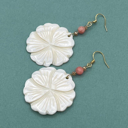 White Hibiscus Shell Pendant Earrings with Pink Shell Accent Bead and Gold Plated Ear Wires