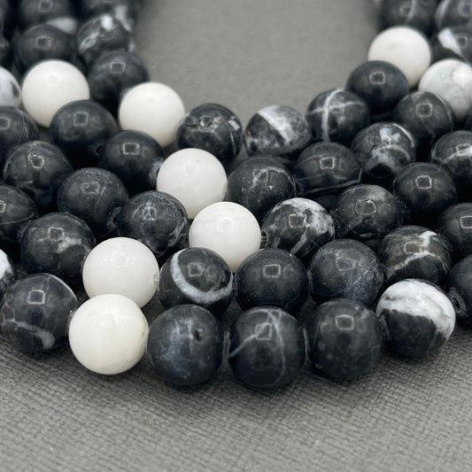 Natural 8mm Natural 8mm Gemstone Zebra Jasper Black and White Smooth Round Strand of Beads