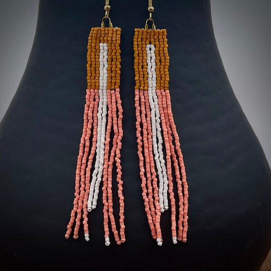 Handmade Coral, Amber and White Miyuki Delica Woven Fringe Beaded Dangle Earrings