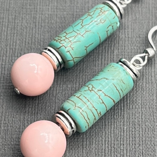 Turquoise Howlite and Pink Dangle Earrings