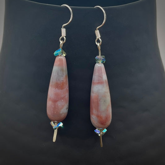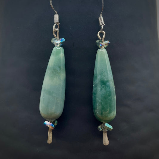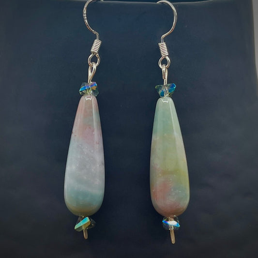 Sterling Silver, Indian Agate Teardrop Earrings with Green Crystal Accents