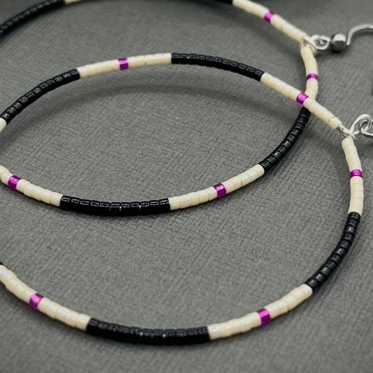 Black and White Miyuki Large Hoop Earrings with Pink Accents