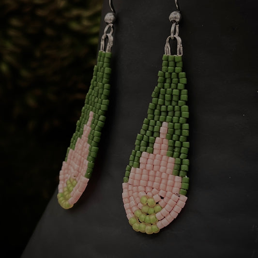 Deep Green, Lime Green, Soft Pink Hand Woven Seed Bead Drop Earrings