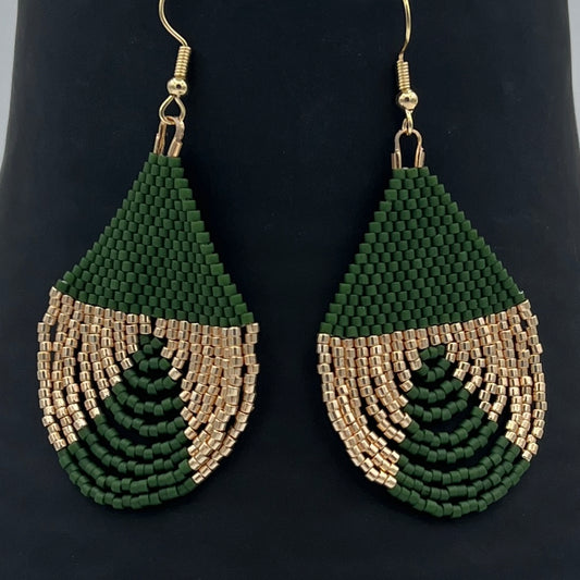 Deep Green and Gold Hand Woven Drop Beaded Earrings