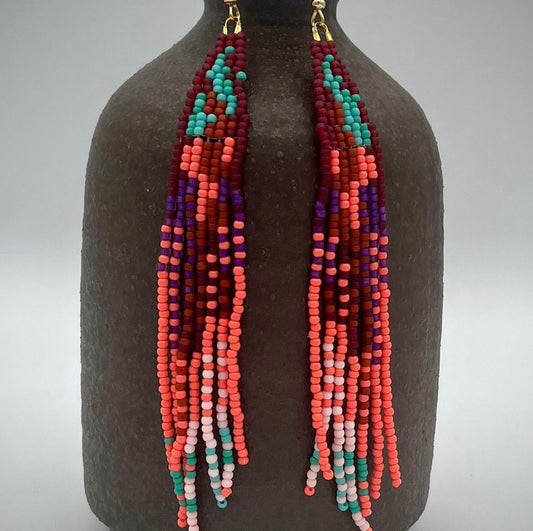 Handmade Coral Turquoise Woven Fringe Beaded Dangle Earrings