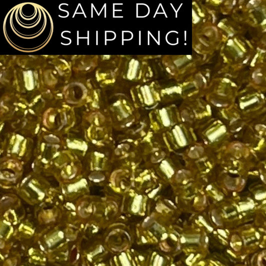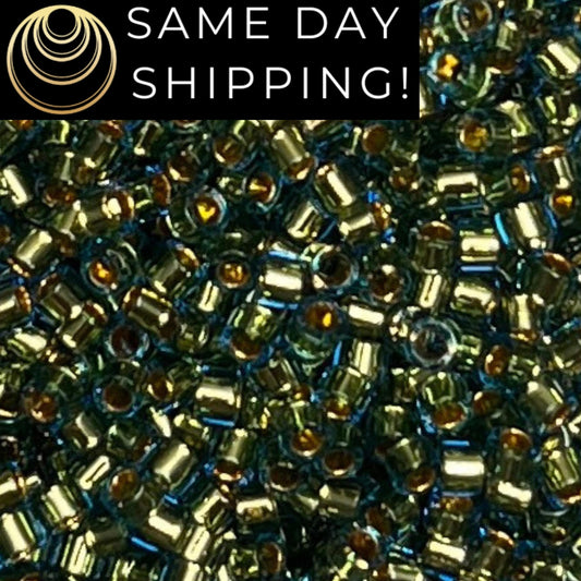DB2523 (1 gram-20 grams) Miyuki Size 11/0 Delica Beads 24kt Gold Lined Moss Green-Free Container! Same Day Shipping!