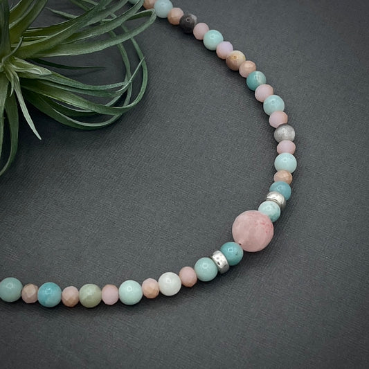 Seaside Vacation Amazonite and Pink Frosted Glass Necklace with Silver Accents