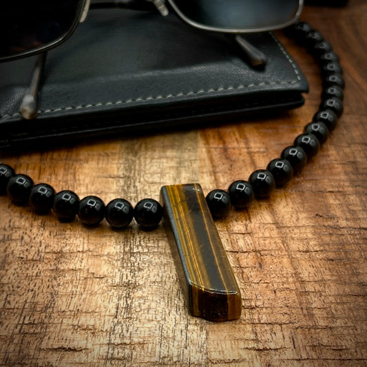 Men’s Masculine Beaded Collar Length Black Onyx and Tiger Eye Pendant Gemstone Necklace