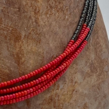 Striking Red and Gun Metal Five Layer Adjustable Seed Bead Necklace 15.5"-20"