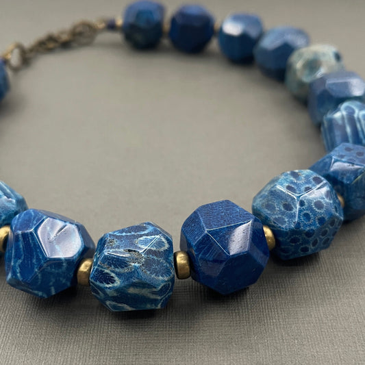 FREE SAME DAY Free SHiPPING! Bright Blue Bold Chunky Statement Fossil Coral Necklace with Bronze Accents, Mother's Day Gift, Gigantic Beads
