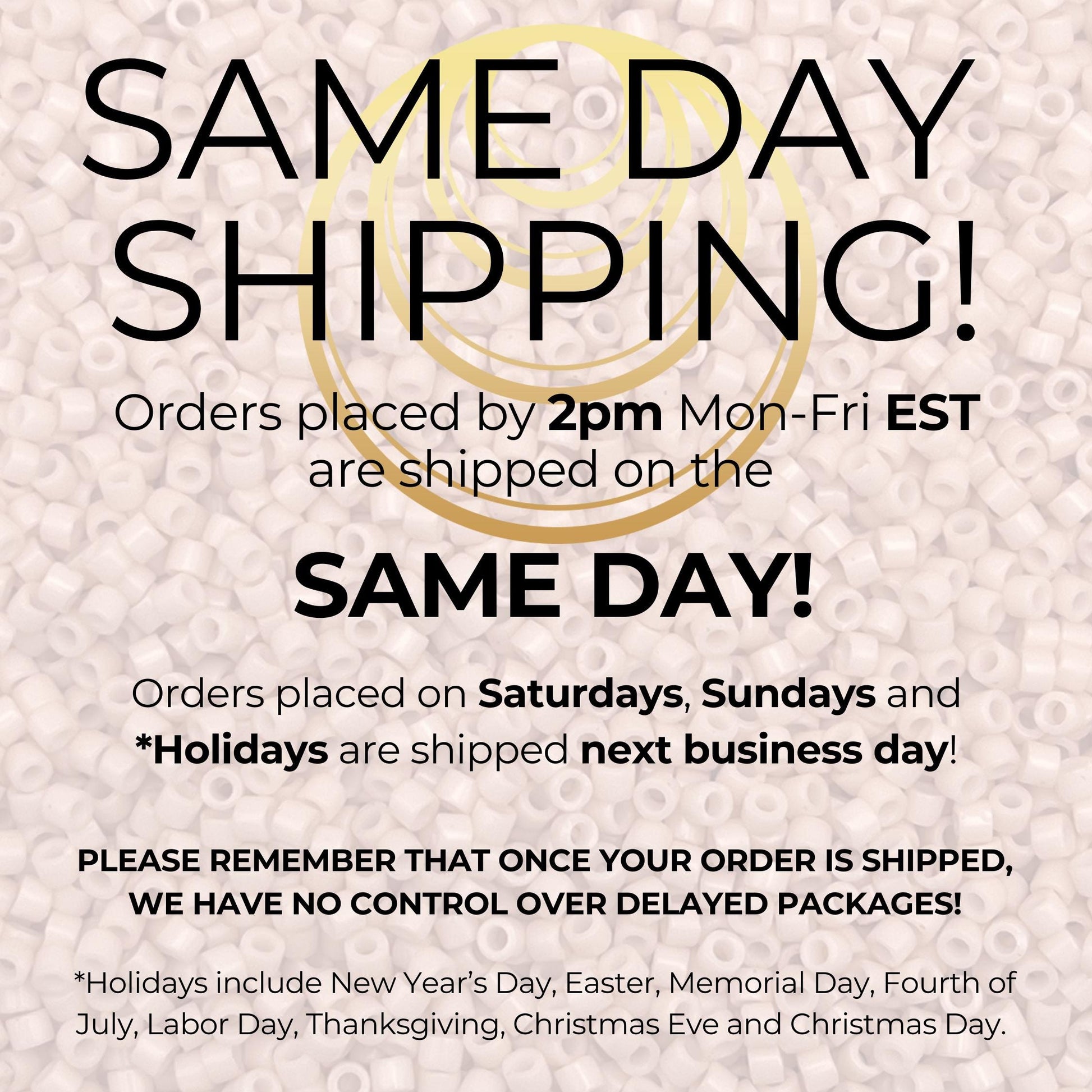 Same day shipping includes items ordered before 2pm EST Mondays through Fridays. Items ordered after 2pm EST, on Saturdays and Sundays are shipped the next business day. PLEASE REMEMBER THAT ONCE YOUR ORDER IS SHIPPED, WE HAVE NO CONTROL OVER DELAYED PACKAGES!
