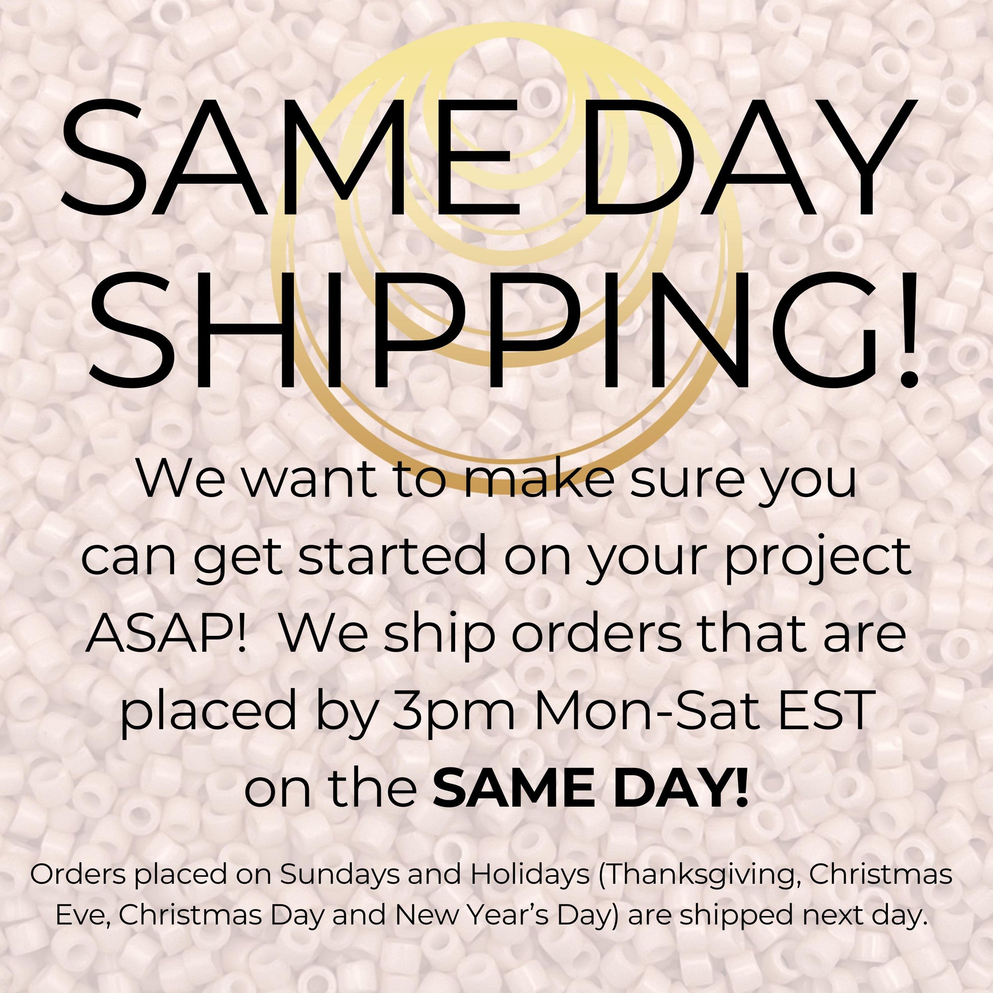 Same day shipping includes items ordered before 1pm EST Mondays through Saturdays. Items ordered after 1pm EST are shipped the next morning. Items ordered on Sundays will be shipped next morning.